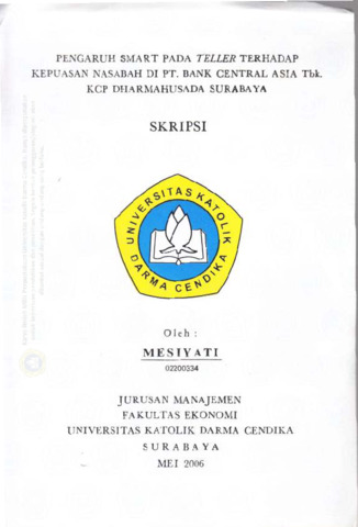 Mesiyati, Mesiyati (2007) Pengaruh Smart pada Teller Terhadap Kepuasan Nasabah di PT. bank Central Asia Tbk. KCP Dharmahusada Surabaya. Undergraduate thesis, Universitas Katolik Darma Cendika Fakultas Ekonomi.