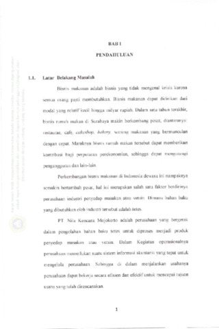 Bisnis makanan adalah bisnis yang tidak mengenal krisis karena semua orang pasti membutuhkan, Bisnis makanan dapat didirikan dari modal yang relatif kecil hingga milyar rupiah. Maraknya bisnis rumah makan tersebut dapat memberikan kontribusi bagi perputaran perekonomian, sehingga dapat mengurangi pengangguran dan lain-lain. Perkembangan bisnis makanan di Indonesia dewasa ini nampaknya semakin bertambah pesat, hal ini merupakan salah satu faktor berdirinya perusahaan industri penyedap masakan atau vetsin. Dimana bahan baku yang dibutuhkan oleh industri tersebut adalah tetes. Maka penulis mengambil rumusan masalah dalam penelitian ini adalah "Bagaimana merancang sistem informasi akuntansi penjualan pada PT. Nila Kencana". Adapun tujuan dari penelitian ini adalah untuk mengetahui sistem informasi akuntansi penjualan pada PT. Nila Kencana. Teknik analisa yang digunakan dalam penelitian ini adalah: menganalisa sistem yang sedang dipakai, meneliti kelemahan dari sistem yang sedang dipakai serta meneliti pekerjaan dan tanggung jawab setiap karyawan, merancang desain sistem yang baru' dan implementasi sistem baru, Adapun berdasarkan penelitian dengan melakukan perbandingan antara sistem informasi akuntansi yang standar dengan sistem informasi akuntansi penjualan pada PT. Nila Kencan4 penulis mengetahui kelemahan-kelemahan sistem yang sedang digunakan di bagian penjualan. Sehingga untuk mengatasi kelemahan tersebut, penulis memberikan usulan perbaikan terhadap Sistem Pengendalian Internal dalam organisasi, sistem otorisasi dan prosedur pencatatan, dan praktik yang sehat. Dan juga perbaikan ke arah sistem informasi akuntansi manual dengan memberikan usulan dalam bentuk Struktur Organisasai dan Data I'low Diagram, di bagian penjualan pada PT. Nila Kencana. Dengan demikian kelemahan dan permasalahan yang ada di bagian penjualan PT. Nila Kencana dapat menemukan solusi yang terbaik,