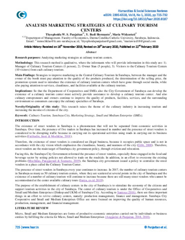 Panjaitan, Thyophoida W.S. and Hermanto, Yustinus Budi and Widyastuti, Maria (2020) ANALYSIS MARKETING STRATEGIES AT CULINARY TOURISM CENTERS. Humanities & Social Sciences Reviews, 8 (1). pp. 725-732. ISSN 2395-6518