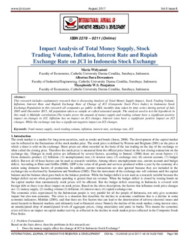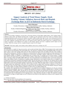 Widyastuti, Maria and Dewantoro, Albertus Daru and Panjaitan, Thyophoida W.S. (2017) Impact Analysis of Total Money Supply, Stock Trading Volume, Inflation, Interest Rate and Rupiah Exchange Rate on JCI in Indonesia Stock Exchange. International Journal of Innovative Research and Development, 6 (8). pp. 186-194. ISSN 2278 – 0211