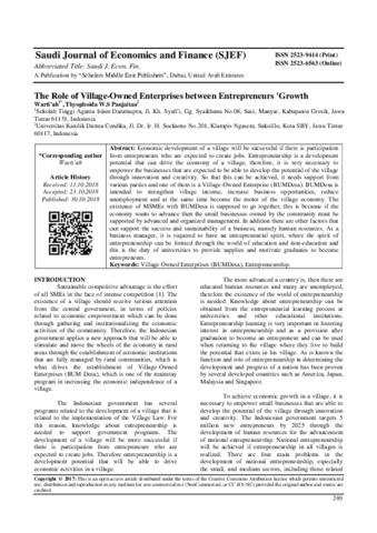 Wartiah, Wartiah and Panjaitan, Thyophoida W.S. (2018) The Role of Village-Owned Enterprises between Entrepreneurs 'Growth. Saudi Journal of Economics and Finance (SJEF), 2 (5). pp. 240-246. ISSN ISSN(Print):2523-9414 ISSN(Online):2523-6563