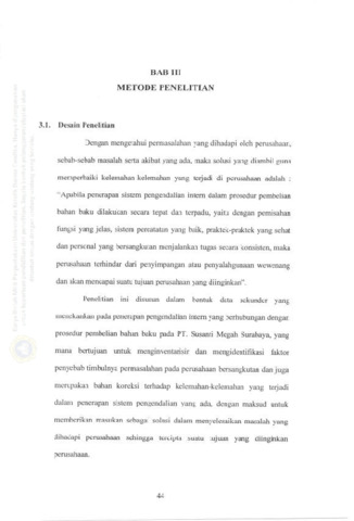 Bahan baku menempati salah satu bagian yang terpenting dalam perusahaan, terutama perusahaan industri (Industrie Manuficturing), merupakan perusahaan yang aktifitasnya sangat terpaut pada produktifitas dengan mengolah bahan baku menjadikannya barang jadi atau barang siap dikonsumsi. Prosedur pembelian bahan baku juga berperan penting dalam kemajuan perusahaan. Adapun permasalahan yang dihadapi PT. Susanti Megah Surabaya yakni dalam melakukan pembelian bahan baku tanpa menggunakan formulir permintaan dan penawaran harga atau surat order pembelian, disamping itu juga adanya perangkapan tugas dan jabatan yakni bagian logistik yang berfungsi melakukan pembelian bahan baku dan bagian produksi, dan tidak ada pemisahan fungsi yang jelas. Dengan adanya permasalahan ini akan berpengaruh terhadap kemajuan perusahaan tersebut, dan membawa resiko yang besar pula bagi perusahaan. Dalam mengantisipasi atau mengatasi masalah tersebut harus adanya penerapan pengendalian intern yang tepat dan baik, yang mana harus adanya sistem dan prosedur akuntansi yang jelas, yang mampu menunjang kegiatan perusahaan secara khusus pada bagian pembelian. Harus ada pemisaian fungsi yang jelas yang mana setiap fungsi saling berhubungan atau udunyu kerjasama yang baik antar fungsi, dan adanya praktek yang sehat dalam kegiatan perusahaan, sehingga dapat menunjang pelaksanaan kegiatan perusahaan demi mencapai tujuan yang diinginkan oleh perusahaan tersebut.