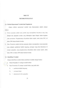 Perekonomian global terasa nampak jelas dipermukaan dewasa ini, yaitu dengan banyak macam-macam promosi penjualan untuk meningkatkan omzet penjualan. Dengan demikian seberapa suksesnya sebuah usaha penjualan akan tergantung pada tingkat promosi penjualan yang dilakukan. Dari latar belakang ini, maka rumusan masalah yang diajukan adalah l) apaliah bmtuk-benftk sales promotion (pemberian hadiah langsung potongan harga dan demontrasi di toko penjualan (X)) berpengaruh tertadap peningtaan omzet Penjualan {11P, 2} manakah bentuk-bentuk sales promotion (pemberian hadiah lanpung, potongfln harga" dan demontrasi di toko penjualan (X)) secara pansial mempun5rai pcngaruh terhadap peningkatan omzet Penjualan (Y)?
