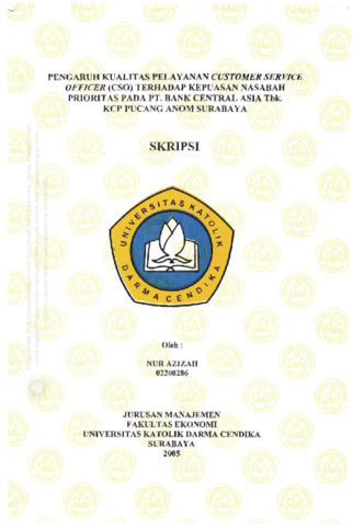 Azizah, Nur (2005) Pengaruh Kualitas Pelayanan Customer Service Officer (SCO) Terhadap Kepuasan Nasabah Prioritas pada PT. Bank Central Asia Tbk KCP Pucang Anom Surabaya. Undergraduate thesis, Universitas Katolik Darma Cendika Fakultas Ekonomi.