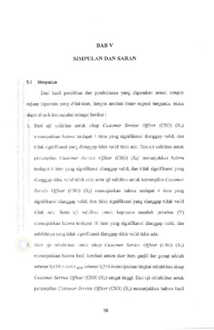 Berdsarkan dari tingkat nasabah PT. Bank Central Asia Tbk. KCP Pucang Anom Surabaya tidak maksimum. Hal ini disebabkan bagian Customer Service Officer (CSO) kurang diberikannya pelatihan pelayanan yang terdiri dari sikap, penampilan, dan ketrarnpilan Customer Service Officer (CSO), sehingga tingkat kepuasan yang diterima khususnya nasabah prioritas mengalami penurunan. Oleh karena itu, upaya PT. Bank Central Asia Tbk. KCP Pucang Anom Surabaya mengadakan pelatihan kerja pelayanan guna menambah skill (keahlian) dan pengetahuan tentang kinerja Customer Service Officer (CSO) (seperti pembukaan rekening, pengetahuan e-chanel, kemampuan menjelaskan berbagai komplain nasabah, penutupan rekening nasabah) dalam pelayanan khususnya nasabah prioritas. Dengan dipero1ehnya pengetahuan tentang pelatihan kerja, pelayanan Customer Service Officer (CSO) menjadi berkualitas sehingga kemungkinan besar loyalitas dan kepuasan nasabah prioritas meningkat. Dengan dernikian terbentukjudul skripsinya "Pengaruh Kualitas Pelayanan Customer Service Officer (CSO) Terhadap Kepuasan Nasabah Prioritas Pada PT. Bank Central Asia Tbk. KCP Pucang Anom Surabaya". Apakah kualitas pelayanan (sikap, penarnpilan, dan ketrampilan) Customer Service Officer (CSO) secara simultan dan parsial berpengaruh terhadap kepuasan nasabah prioritas pada PT. Bank Central Asia Tok. KCP Pucang Anom Surabaya ?