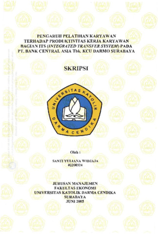 Widjaja, Santi Yuliana (2005) Pengaruh Pelatihan Karyawan Terhadap Produktivitas Kerja Karyawan Bagian ITS (Integrated Transfer System) Pada PT. Bank Central Asia Tbk, KCU Darmo Surabaya. Undergraduate thesis, Universitas Katolik Darma Cendika Fakultas Ekonomi.