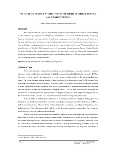 Purbiyati, Yuliana Sri (2021) The Influence Of Group Investigation On The Ability Of Critical Thinking And Scientific Writing. Magister Scientiae, 49 (1). pp. 30-44. ISSN ISSN 2622-7959