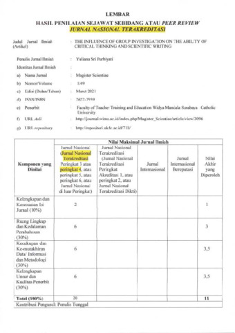HASIL SIMILARITY-Yuliana Sri Purbiyati-THE INFLUENCE OF GROUP INVESTIGATION ON THE ABILITY OF CRITICAL THINKING AND SCIENTIFIC WRITING.pdf Download (1MB) | Preview |