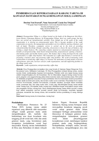 Irawati, Desrina Yusi and Suryawati, Nany and Trisjanti, Lucia Ina (2021) Pemberdayaan Kewirausahaan Karang Taruna Di Kawasan Bantaran Sungai Bengawan Solo, Lamongan. Jurnal ABIDUMASY, 2 (1). pp. 13-18. ISSN e-issn : 2721-5334
