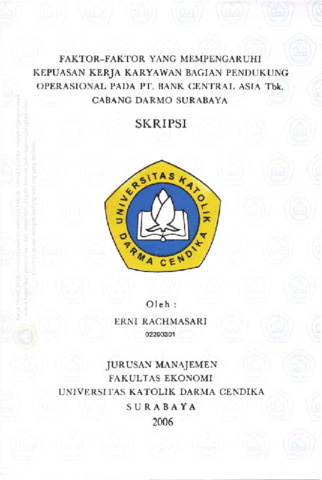 Rachmasari, Erni (2006) Faktor-faktor yang mempengaruhi Kepuasan Kerja Karyawan bagian Pendukung Operasional pada PT. Bank Central Asia Tbk Cabang Darmo Surabaya. Undergraduate thesis, Universitas Katolik Darma Cendika Fakultas Ekonomi.