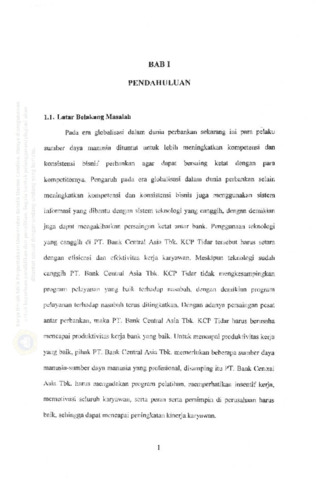 Padu pcnulisan skripsi ini mcrnbahas mengcnai pcngaruh inscntil, motivasi, gaya kepemimpinan terhadap produktivitas kerja studi kasus pada PT. Bank Central Asia Tbk. KCP Tidar Surabaya. Adapun latar belakang penulisan skripsi kepercayaan, keamanan, layanan berpengaruh terhadap kepuasan nasabah pada PT. BCA Tbk. KCP Tidar Surabaya. Berdasarkan latar belakang masalah, maka perumusan masalahnya adalah apakah insentif, motivasi, dan gaya kepemimpinan secara serempak dan parsial berpengaruh terhadap produktivitas kerja pada PT. Bank Central Asia Tbk. KCP Tidar Surabaya ? Tujuan penelitian adalah untuk mengetahui apakah insentif, motivasi, dan gaya kepemimpinan secara serempak berpengaruh terhadap produktivitas kerja pada PT. Bank Central Asia Tbk. KCP Tidar Surabaya. Jenis penelitian menggunakan analisis regresi linier berganda. Sampel yang digunakan 50 karyawan di PT. Bank Central Asia Tbk. KCP Tidar Surabaya yang dilakukan bulan Januari 2006. Jcnis data, adalah kuantitatif dan kualitatif. Sumber data menggunakan data primer dan sekunder. Teknik pengumpulan data dengan rite! kepustakaan dan lapangan. Pengolahan data dengan uji validitas, uji reliabilitas, pengujian hipotesis dengan uji F, dan uji t. Pengujian hipotesis dilakukan dcngun tcknik analisis data statistik program SPSS 11.0.