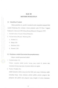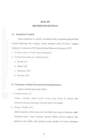 Penelitian ini menguji mengenai pengarul marketing mix terhadap volurne penjualan pada N.V. N-Nusatenggara Trading Co (Indonesia) LTD Cabang Ruteng Kabupten Manggarai-NTT,selama tahun 1997 -2004- Pada penelitian ini penguji menggunakat markeltug mlr yang mempengaruhi volume penjualan. Dengan data dan pengrrji menggunakan metode relasi dan korelasi. Jenis penelitian yang digunakan oleh penulis adalah penelitian diskiptif bempa studi kasus dengan obyek penelitian N.V. Nusatenggara Trading Co (Indonesia) LTD Cabang Ruteng Kabupaten ManggaraiNTT. Jenis Dta yang digunakan adalah data kualitatif dan sumber datanya data internal. Terdapat empat hal yang di analisa dao dibahas oleh penulis yaitu Produk, Harga, Distribusi dan Promosi Hasil penelitian ini mendukung hipotesis yang ada bahwa variabel bebas (marketing nul mempengaruhi volume penjualan. Hal ini dibuhikan dengn angka R2 sebesar 0,999 dan ada penganrh dominan dari salah satu variabel m* yutu promosi. Nilar dominan promosi mempuyai nilai contigensi yang paling tinggi yaitu perbandingan antara T-htung dengan T-tabel sebesar 2,353, hal ini membuktikan bahwa mdrketing mu mempunyai pengaruh yang sangat positif dan searah trhadap volume peojualan,