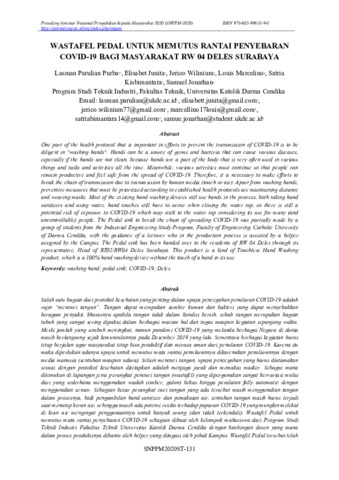 Purba, Lasman Parulian and Junita, Elisabet and Wilinium, Jerico and Marcelino, Louis and Kisbimantara, Satria and Jonathan, Samuel (2020) WASTAFEL PEDAL UNTUK MEMUTUS RANTAI PENYEBARAN COVID-19 BAGI MASYARAKAT RW 04 DELES SURABAYA. In: Prosiding Seminar Nasional Pengabdian kepada Masyarakat 2020. SNPPM2020, 1 (2020). Lembaga Penelitian dan Pengabdian Kepada Masyarakat Universitas Negeri Jakarta, Jakarta, pp. P-131-P-139. ISBN 978-602-99618-9-8