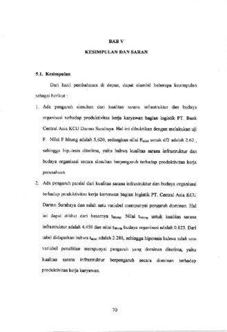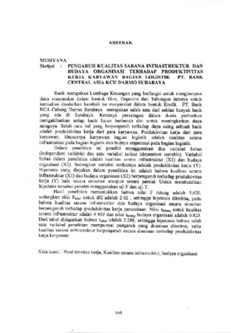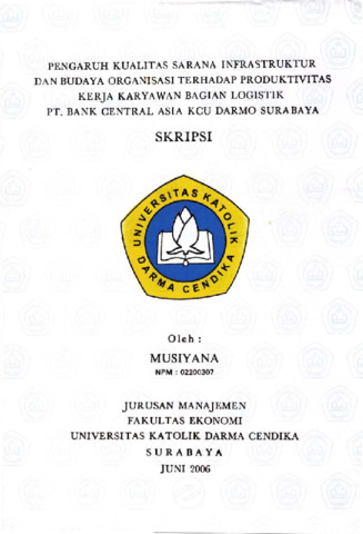 Musiyana, Musiana (2006) Pengaruh Kualitas Sarana Infrastruktur dan Budaya organisasi Terhadap Produktivitasnya Kerja Karyawan bagian Logistik PT. Bank Central Asia KCU Darmo Surbaya. Undergraduate thesis, Universitas Katolik Darma Cendika Fakultas Ekonomi.
