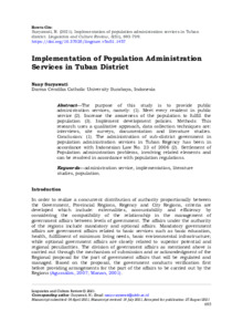 interviews, site surveys, documentation and literature studies. Conclusion: (1). The administration of sub-district government in population administration services in Tuban Regency has been in accordance with Indonesian Law No. 23 of 2006 (2). Settlement of Population administration problems, involving related elements and