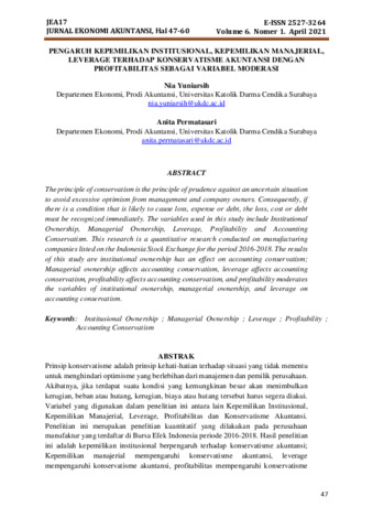 Yuniarsih, Nia and Permatasari, Anita (2021) Pengaruh Kepemilikan Institusional, Kepemilikan Manajerial, Leverage Terhadap Konservatisme Akuntansi dengan Profitabilitas sebagai Variabel Moderasi. Jurnal Ekonomi Akuntansi (JEA17), 6 (1). pp. 47-60. ISSN 2527-3264