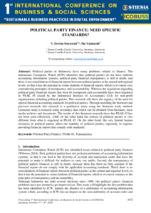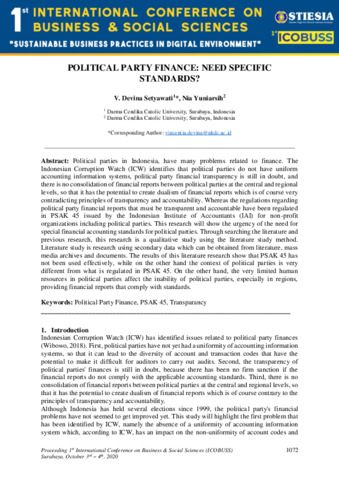 Setyawati, V. Devina and Yuniarsih, Nia (2020) Political Party Finance : Need Spefific Standars? In: Proceeding 1st International Conference on Business & Social Sciences (ICOBUSS). STIESIA SURABAYA, Surabaya, pp. 1072-1078. ISBN 2746-5667