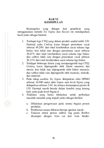 persentase produk cacat sebesar 5,09% .Untuk itu perlu dilakukan beberapa analisa untuk menangani masalah tersebut serta memberikan usulan perbaikan bagi pihak yang menjadi objek penelitian. Ada dua metode yang digunakan dalam penelitian ini yaitu metode Six Sigma dan metode Kaizen. Proses produksi pada UD. Darmaji mendapatkan nilai DPMO sebesar 16.900, itu artinya proses produksi berada pada level sigma 3,63. Nilai Sigma 3,63 memiliki arti yaitu kemampuan proses di UD. Darmaji masih berada dalam kondisi yang kurang baik yaitu pada level Sigma 6 .Didapati juga tiga jenis CTQ yang mempengaruhi kulitas pada produk sandal di UD. Darmaji yaitu Cutting kasar dengan presentase sebesar 49,20%, lem tidak rata dengan presentase sebesar 30,67%, dan sablon tidak rata dengan presentase sebesar 20,13%. Dengan presentase tersebut terdapat beberapa faktor yang mempengaruhi setiap CTQ yaitu manusia, metode, material, dan mesin. Metode Kaizen mendapat peranan penting untuk penanganan masalah yang terjadi. Penggunaan 5S digunakan untuk penganan CTQ yang memiliki nilai presentase yang paling tinggi yaitu pada proses Cutting dengan empertimbangkan pemilahan, penataan, kebersihan,pemantapan, dan pembiasaan. Hal tersebut dilakukan karena penyebab Cutting kasar yaitu manusia yang sering lupa menaruh alat Maintenance dikarenakan lingkungan yang kurang rapi.