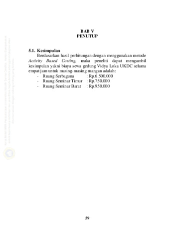 mempertimbangkan harga yang ditawarkan para pesaing di sekitar Surabaya. Oleh karena itu diperlukan metode yang memberikan ketepatan dalam menentukan biaya sewa gedung Vidya Loka UKDC yang seharusnya yaitu metode Activity Based Costing. Langkah-langkah dalam perhitungan menggunakan metode Activity Based Costing yaitu menghitung biaya aktivitas-aktivitas dalam gedung, mengidentifikasi aktivitas sesuai dengan kategorinya, mengidentifikasi cost driver dari setiap biaya aktivitas, menentukan tarif per unit cost driver, menghitung pembebanan biaya overhead serta menentukan biaya sewa gedung. Hasil perhitungan biaya sewa gedung Vidya Loka UKDC dengan menggunakan metode Activity Based Costing untuk Ruang Serbaguna sebesar Rp.6.500.000; Ruang Seminar Timur sebesarRp.750.000 dan Ruang Seminar Barat sebesar Rp.950.000.
