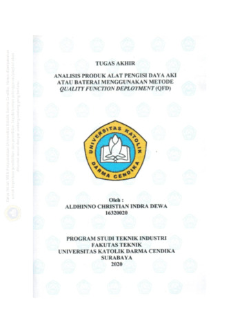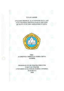 Dewa, Aldhinno Christian Indra (2020) Analisis Produk Alat Pengisi Daya Aki Atau Baterai Menggunakan Metode Quality Function Deployment (QFD). Undergraduate thesis, Universitas Katolik Darma Cendika Fakultas Teknik.