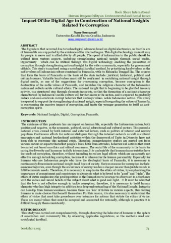 Suryawati, Nany (2021) Impact Of the Digital Age in Construction of National Insights Related To Corruption. In: Human Responsibility on Environmental and Social Issues. Book Shore International, Maharashtra, India, pp. 74-78. ISBN 978-93-90753-95-6