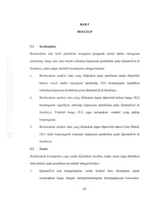 Dunia fashion membawa pengaruh yang besar terhadap gaya hidup dan globalisasi. Mengikuti perkembangan zaman, pelaku bisnis dapat menciptakan produk dengan berbagai inovasi, kreativitas, trend dan gaya hidup yang baru. Setiap pelaku bisnis selalu dituntut agar dapat menciptakan keunggulan yang kompetitif dan berkesinambungan dalam menghadapi banyaknya para pesaing yang bergerak pada industri yang sama. Tujuan dari penelitian untuk mengetahui Pengaruh Social Media Instagram Marketing, Harga dan Citra Merek Terhadap Keputusan Pembelian pada Quinnell.id di Surabaya. Pendekatan yang digunakan dalam penelitian ini adalah kuantitatif. Populasi pada penelitian ini adalah semua konsumen Instagram pada Quinnell.id di Surabaya. Sampel yang diambil adalah konsumen yang berumur 17 tahun ke atas dan konsumen yang pernah membeli pada Instagram Quinnell.id di Surabaya minimal pembelian 1 kali. Jumlah sampel yang diambil sebanyak 75 responden. Analisis data ini meliputi uji validitas, uji reliabilitas, uji asumsi klasik, uji regresi linier berganda, uji koefisien determinasi dan uji t. Dalam pengujian skripsi ini menggunakan SPSS 24. Semua item pernyataan pada setiap variabel memiliki nilai rhitung > rtabel (0,2272) sehingga dapat disimpulkan semua item pernyataan adalah valid. Semua variabel penelitian memiliki nilai Cronbach’s Alpha > 0,60 sehingga semua variabel dinyatakan reliabel. Berdasarkan hasil pengolahan data, nilai R Square sebesar 0,508 atau 50,8% dengan Adjusted R Square sebesar 0,488 atau 48,8%. Persentase ini menunjukkan bahwa Social Media Instagram Marketing, Harga dan Citra Merek memberikan kontribusi sedang / cukup pada keputusan pembelian sebesar 48,8% dan sisanya 51,2% dipengaruhi oleh faktor lain. Berdasarkan uji terdapat dikatakan bahwa Social Media Instagram Marketing berpengaruh signifikan terhadap Keputusan Pembelian dengan nilai thitung (2,330) > ttabel (1,99394) dan nilai signifikansi 0,023 < 0,05. Harga berpengaruh signifikan terhadap Keputusan Pembelian dengan nilai thitung (2,829) > ttabel (1,99394) dan nilai signifikansi sebesar 0,006 < 0,05. Citra Merek tidak berpengaruh terhadap Keputusan Pembelian dengan nilai thitung (1,846) < ttabel (1,99394) dan nilai signifikansi sebesar 0,069 > 0,05.
