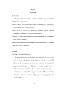 Berkembangnya zaman bisnis coffeeshop di Jawa timur khususnya Surabaya menjamur. Salah satu coffeeshop yang menjamur di Surabaya adalah Ejji coffee corner yang lokasinya terletak di Jalan Simpang Darmo Permai Utara I No. 26. Penelitian ini bertujuan untuk mengetahui Pengaruh Kualitas produk (X1), Electronic word of mouth (X2), Lokasi (X3) dan Harga (X4) terhadap Keputusan pembelian konsumen (Y) Ejji coffee corner di Surabaya. Penelitian ini merupakan penelitian kuantitatif dan populasi dalam penelitian ini adalah Konsumen yang pernah membeli minuman di Ejji coffee corner Jl. Simpang Darmo Permai utara I No. 26 Surabaya, penentuan sampel menggunakan metode purposive sampling dengan sampel sebanyak 100 responden. Analisis data yang digunakan dalam penelitian ini adalah Analisis deskriptif dan Analisis regresi linear berganda menggunakan aplikasi SPSS versi 20. Hasil penelitian menunjukkan bahwa semua item pernyataan masing�masing variabel dalam kuesioner dinyatakan valid dengan rhitung > rtabel sebesar 0,1966,