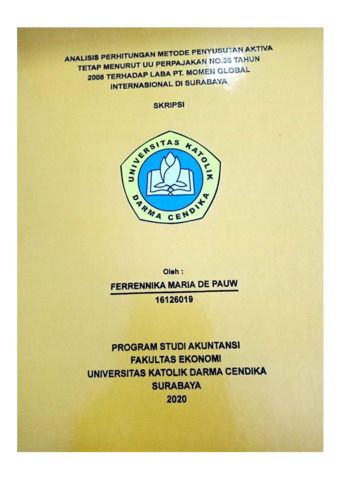Pauw, Ferrennika Maria de (2020) Analisis Perhitungan Metode Penyusutan Aktiva Tetap Menurut UU Perpajakan No.36 Tahun 2008 Terhadap Laba Pada Pt. Momen Global Internasional Di Surabaya. Undergraduate thesis, Universitas Katolik Darma Cendika Fakultas Ekonomi.