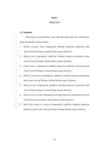 Rumah makan dengan berbagai konsep dan menu yang beragam sudah banyak ditemui di Surabaya sehingga pelaku bisnis ingin membuat hal yang baru bagi konsumen. Salah satu rumah makan yang mengikuti konsep tersebut adalah Ayam Goreng Nelongso Cabang Darmawangsa Surabaya. Penelitian ini bertujuan untuk mengetahui pengaruh marketing mix terhadap keputusan pembelian pada Ayam Goreng Nelongso Cabang Darmawangsa Surabaya. Metode pengambilan sampel yang digunakan adalah Purposive sampling. Sampel pada penelitian ini adalah 100 responden yang pernah melakukan pembelian di Ayam Goreng Nelongso Cabang Darmawangsa Surabaya. Pengolahan data dengan menggunakan Program SPSS Statistik versi 22.0 Berdasarkan hasil pengolahan data diperoleh hasil sebagai berikut : produk tidak berpengaruh terhadap keputusan pembelian dengan hasil t hitung (-0,049) < tabel (1.986), hargaberpengaruh signifikan terhadap terhadap keputusan pembelian dengan hasil terhitung (2.801) > t tabel (1.986), lokasi berpengaruh signifikan terhadap keputusan pembelian dengan hasil -t hitung (-2.58) < -t tabel (-1.986), promosi berpengaruh signifikan terhadap terhadap keputusan pembelian dengan hasil t hitung (2.083) >t tabel (1.986), people berpengaruh terhadap terhadap keputusan pembelian dengan hasil t hitung (2.344) > t tabel (1.986), proses tidak berpengaruh terhadap keputusan pembelian dengan hasil t hitung 0.785) < tabel (1.986), bukti fisik berpengaruh signifikan terhadap terhadap keputusan pembelian dengan hasil hitung (3.499) > t tabel (1.986)
