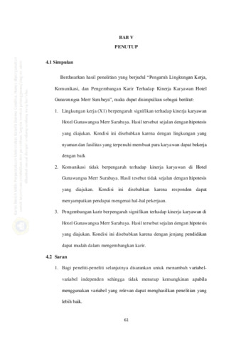 Penelitian ini bertujuan untuk (1) mengetahui pengaruh lingkungan kerja terhadap kinerja karyawan. (2) mengetahui pengaruh komunikasi terhadap kinerja karyawan. (3) mengetahui pengaruh pengembangan karir terhadap kinerja karyawan. Metode dalam penelitian ini adalah kuantitatif menggunakan SPSS 20, populasi dalam penelitian ini berjumlah 60 orang yaitu seluruh karyawan Hotel Gunawangsa Merr dengan menggunakan teknik pendekatan sampling jenuh. Data pengumpulan melalui kuesioner. Hasil analisis menggunakan validitas, reliabilitas, uji determinasi, uji regresi linier sederhana, uji regresi linier berganda, dan ujit.Berdasarkan hasil pengolahan data diperoleh hasil sebagai berikut: Lingkungan kerja berpengaruh signifikan terhadap kinerja karyawan karena dengan lingkungan yang nyaman dan fasilitas yang terpenuhi membuat para karyawan dapat bekerja dengan baik. Komunikasi tidak berpengaruh signifikan terhadap kinerja karyawan karena responden dapat menyampaikan pendapat mengenai hal�hal pekerjaan dan atasan memberikan penjelasan tentang pekejaan yang harus dilakukan. Sedangkan Pengembangan karir berpengaruh signifikan terhadap kinerja karena dengan jenjang pendidikan dapat mudah dalam mengembangkan karir