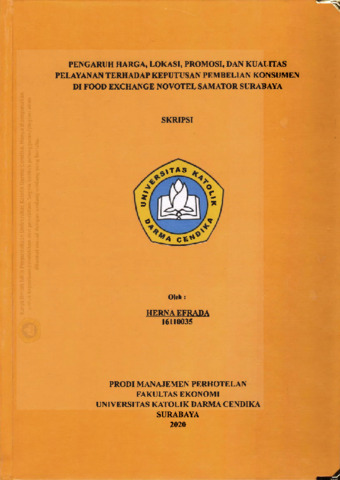 Efrada, Herna (2020) Pengaruh Harga,Lokasi,Promosi,Dan Kualitas Pelayanan Terhadap Keputusan Pembelian Konsumen di Food Ecxhange Novotel Samator Surabaya. Undergraduate thesis, Universitas Katolik Darma Cendika Fakultas Ekonomi.